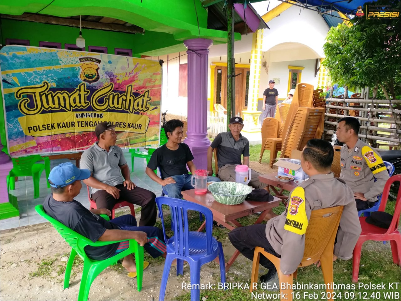 Kaur – Polsek Kaur Tengah Polres Kaur melaksanakan kegiatan Jumat Curhat dengan nelayan Desa Padang Baru Kecamatan Kaur Tengah Kabupaten Kaur. Kegiatan dipimpin oleh Kapolsek Kaur Tengah Iptu Kosseri, S.H., bersama Personel, Bripka Soni Irawan, Bripka Radius Gea dan Bripka Nelva Paradsye.