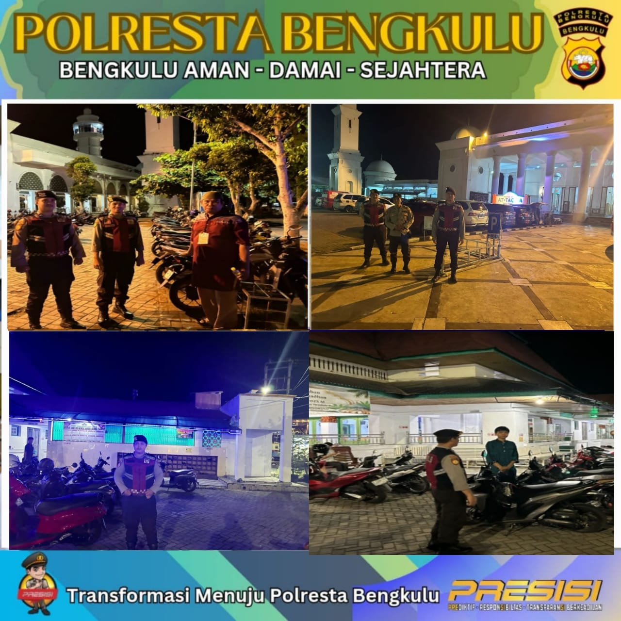 Bengkulu – Dalam rangka memastikan keamanan dan kenyamanan masyarakat selama bulan suci Ramadan, Sat Samapta Polresta Bengkulu melaksanakan patroli pengamanan salat Isya dan Tarawih di sejumlah masjid pada Kamis malam (13/3/2025). Patroli ini dipimpin oleh Aipda Syahreza Phalepi, Bripda Afif Fadhillah, dan Bripda Pujisan Aprianto, dengan menyasar beberapa lokasi ibadah, termasuk Masjid Jamik di Jalan Letjen Soeprapto dan Masjid At-Taqwa di Jalan Nala. Selain itu, rute patroli juga mencakup Jalan Jenderal Sudirman, Jalan Soekarno Hatta, Jalan Ciliwung, Jalan Pembangunan, dan Jalan S. Parman.