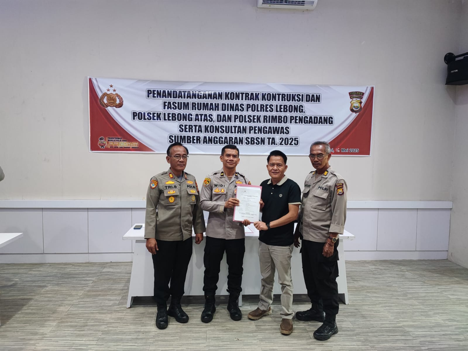 Lebong – Telah dilaksanakan penandatanganan kontrak konstruksi dan Fasum Rumdin Polres Lebong, Polsek Lebong Atas, Polsek Rimbo Pengadang, serta konsultan pengawas, dan dilanjutkan kegiatan titik nol pembangunan Rumdin.
