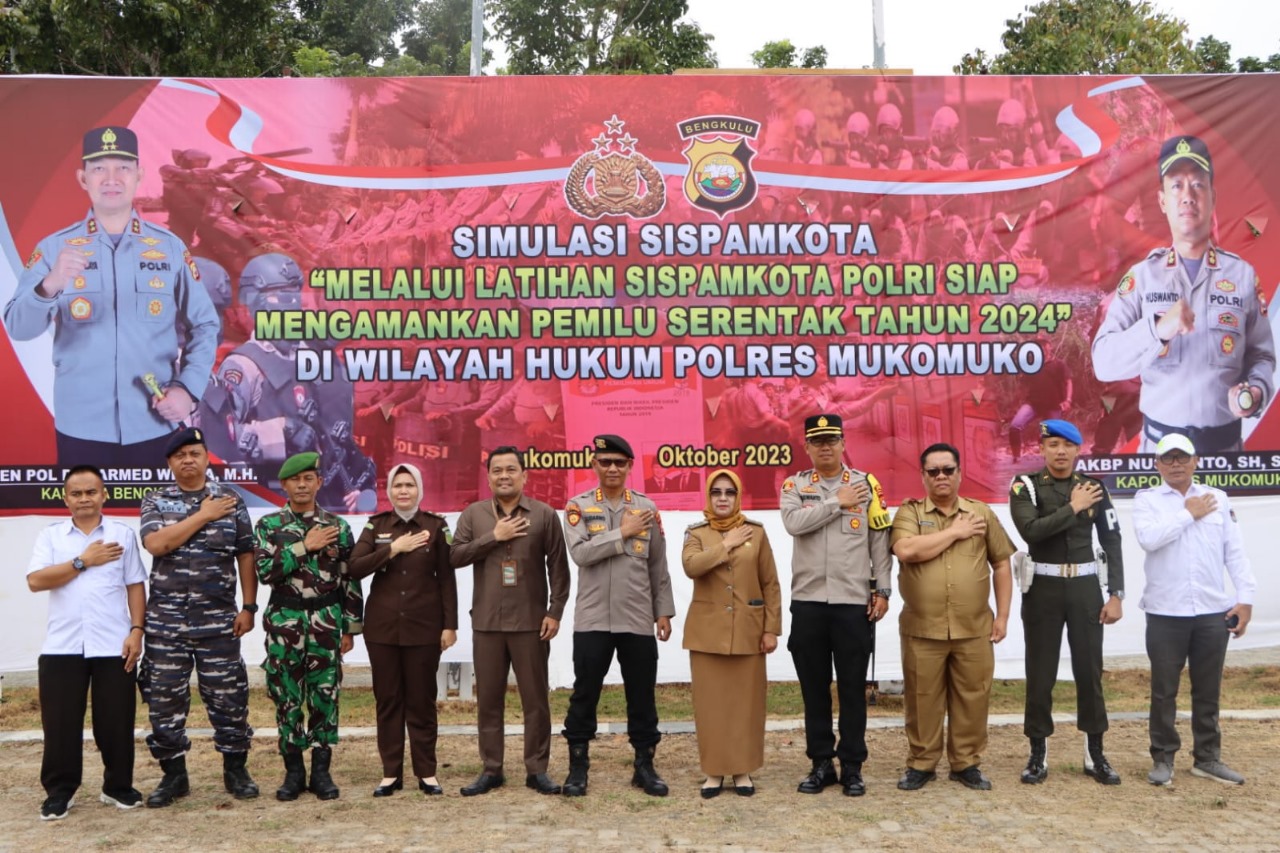 Polres Mukomuko menerapkan sistem simulasi sispamkota sesuai dengan kondisi di lapangan untuk menciptakan suasana kesiapsiagaan Pemilu 2024 dengan kolaborasi TNI, Polri, Pemda, KPU dan Bawaslu Mukomuko.