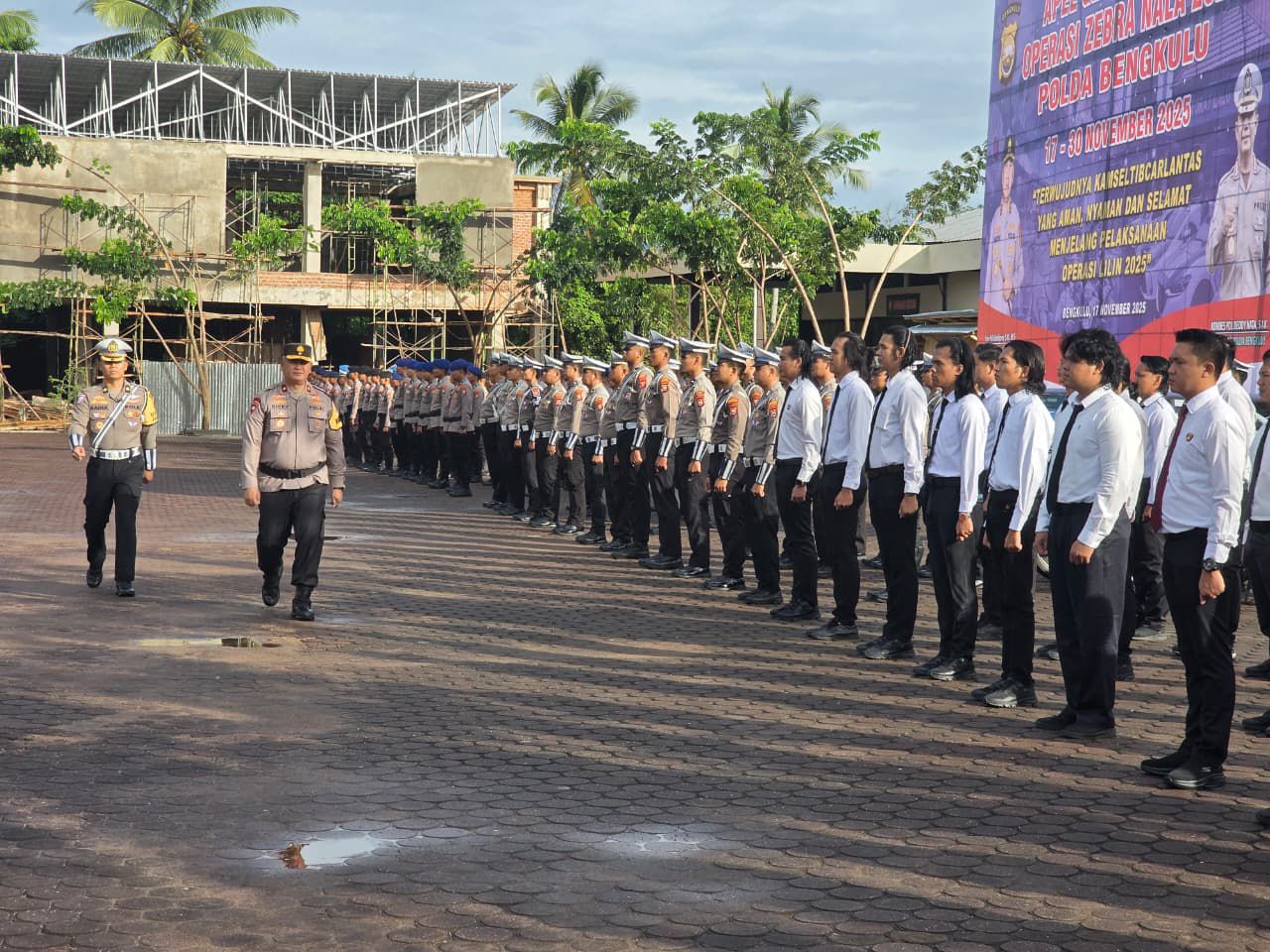 BENGKULU – Wakapolda Bengkulu, Brigjen Pol. Dicky Sondani, S.I.K., M.H., memimpin apel gelar pasukan dalam rangka Operasi Zebra Nala 2025 di Lapangan Anton Soedjarwo Polda Bengkulu pada Senin, 17 November 2025. Apel gelar ini di hadiri oleh PJU Polda Bengkulu, Kakanwil Jasa Raharja Bengkulu, Kadishub Provinsi Bengkulu, Kepala BPTD Kelas II Bengkulu, Kepala Bappenda Provinsi Bengkulu, Kasatpol PP Provinsi Bengkulu dan Seluruh Peserta Apel Gelar Pasukan.