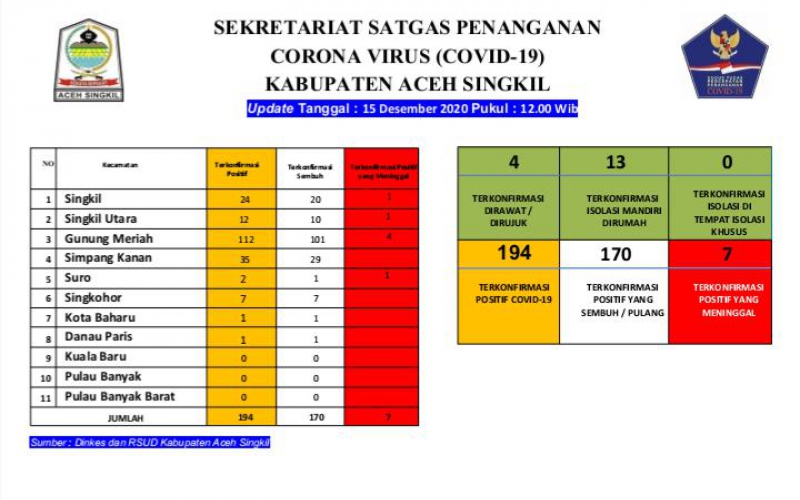 Dengan itu, menambah deretan catatan update data Sekretariat Satgas Penanganan Covid-19 Kabupaten Aceh Singkil, pertanggal 15/12/2020, pukul 12.00 wib, menjadi 194 orang pasien yang terkonfirmasi positif, dan 170 orang sembuh.