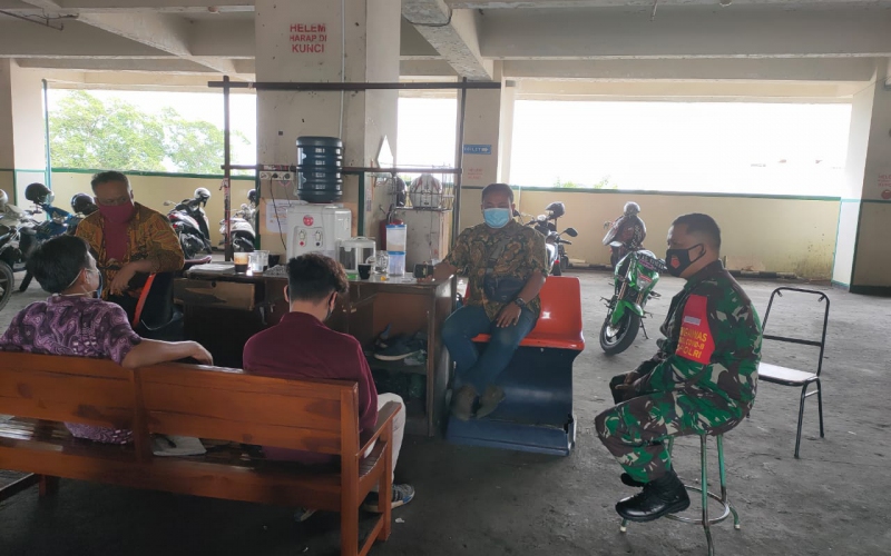 Babinsa Kelurahan Kemlayan Koramil 03 Serengan Kodim 0735 Surakarta Koptu Catur handoko melaksanakan pengecekan dan penerapan edukasi Pemberlakuan Pembatasan Kegiatan Masyarakat (PPKM) dengan Satpam dan penjaga parkir di Matahari Singosaren Plaza, Senin (18/01/2021)