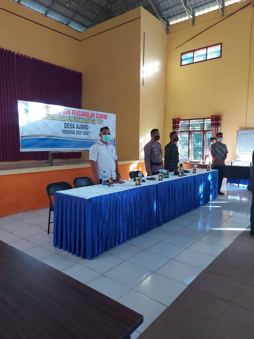 Pengambilan sumpah jabatan anggota BPD Desa Ajang dipimpin oleh Camat Permata Kecubung. Turut hadir dalam kesempatan itu, Kapolsek Permata Kecubung, Babinkamtibmas desa Ajang, Kades se-kecamatan Permata Kecubung, tokoh masyarakat, tokoh agama, tokoh Adat, Kadus, Ketua RW, Ketua RT,se – Desa Ajang.