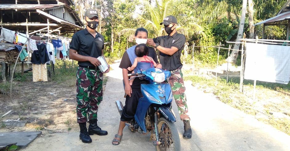 Sintang, Kalbar – hentikan pelintas jalan, itulah cara Batalyon Infanteri 642/Kapuas membagikan masker langsung, di jalan sengkuang, Kec. Sintang, Kab. Sintang, Kalimantan Barat.