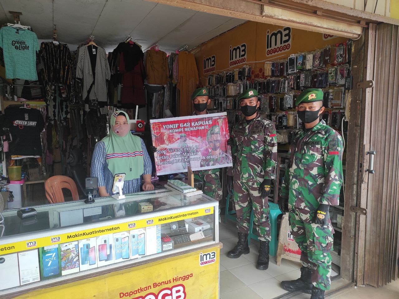 Sintang, Kalbar – Sebagai upaya mencegah dan menanggulangi penyebaran Covid – 19, Batalyon Infanteri 642/Kapuas memberikan himbauan kepada warga untuk melaksanakan disiplin protokol kesehatan dengan membaginan masker di sekitaran pasar impres sintang.