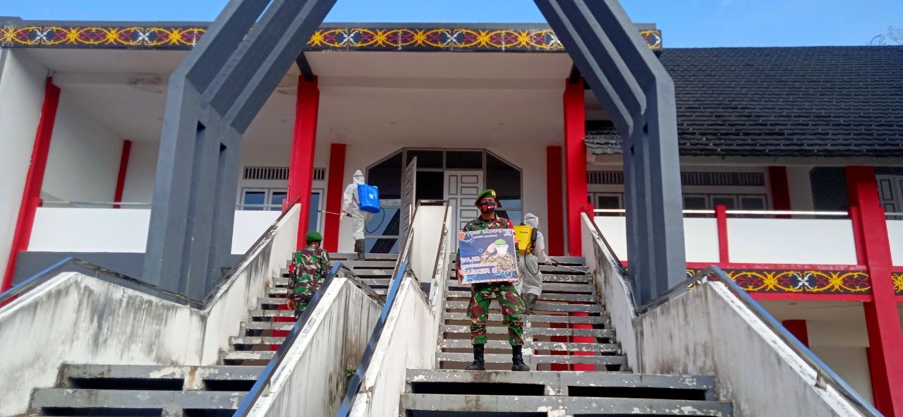 Melawi, Kalbar – Untuk mencegah penyebaran Covid – 19, Batalyon Infanteri 642/Kapuas menyemprot desinfektan, Melawi, Kalbar.