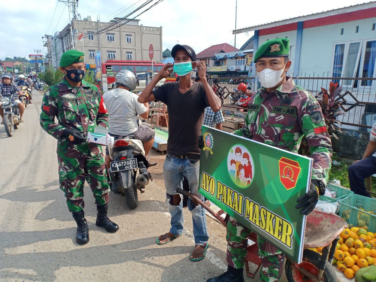 Sintang, Kalbar – Untuk mencegah penyebaran Covid – 19, Batalyon Infanteri 642/Kapuas menyemprot desinfektan, Sintang, Kalbar.