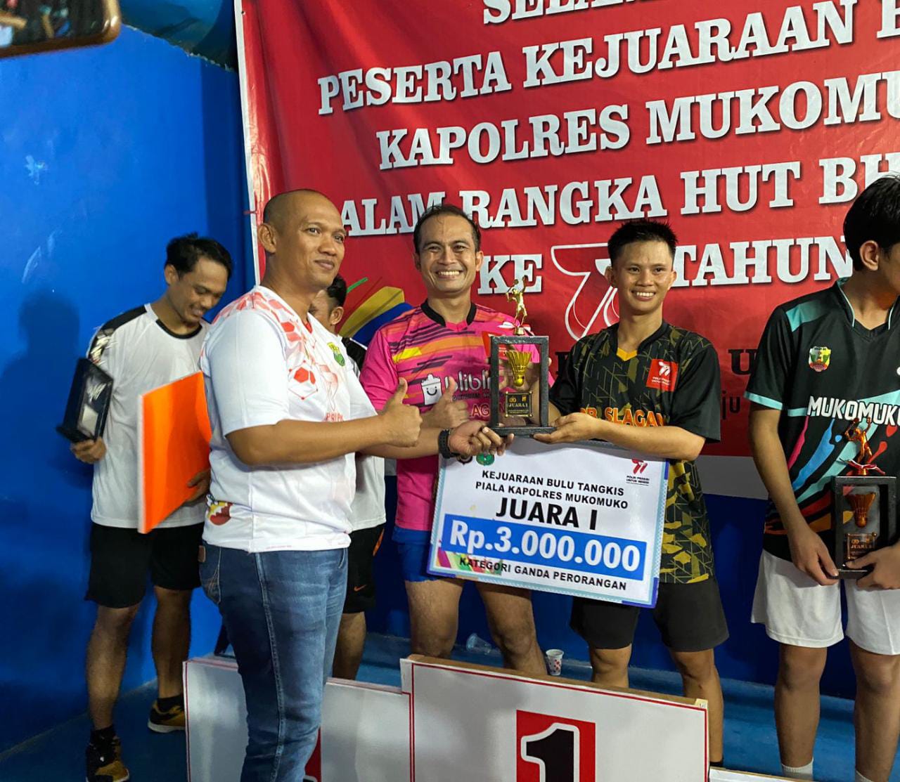 Adapun pemenang turnamen Badminton ini yaitu Juara 1 Tim PB.Selagan AKP I Gde Arya Nandana, S.H,.M.H – Dika dengan membawa Tropy, Piagam dan uang tunai sebesar Rp. 3.000.000,-. Juara 2 Tim PB. Satria Jaya Mukomuko Bram-Riski dengan membawa Tropy, Piagam dan uang Rp. 2.000.000,-. Juara 3 Tim PB. Satria Jaya Mukomuko Mikel – Alvi dengan membawa Tropy, Piagam dan uang Rp. 2.000.000,- dan Juara 4 Tim PB. Selagan diraih oleh pasangan AKP Untoro, S.H., M.H., dan Doni dengan membawa Tropy, Piagam dan uang Rp. 500.000,-.