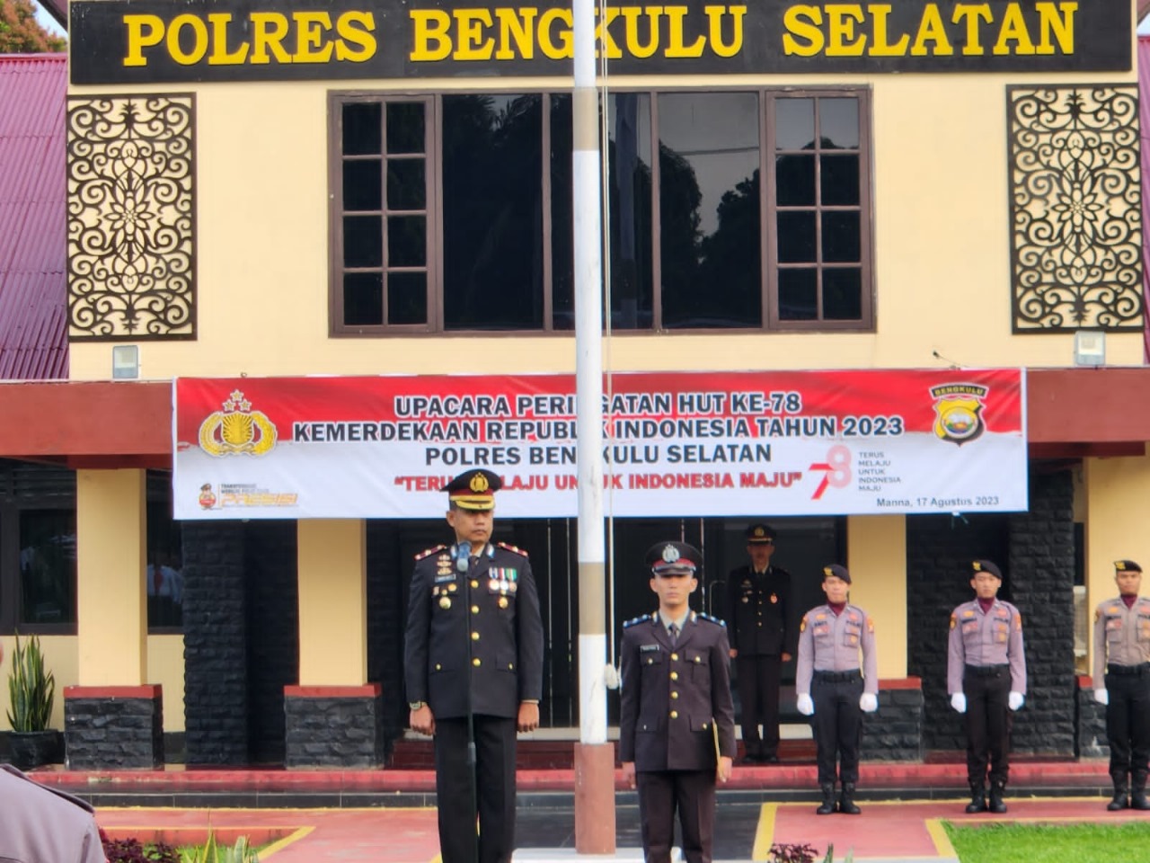 Dalam upacara tersebut, Wakapolres Bengkulu Selatan Kompol Rahmat Hadi F S.H., S.I.K., sebagai Inspektur upacara dan Iptu Solihin sebagai perwira Upacara dengan komandan Upacara Ipda Bambang Iswanto dan dalam upacara tersebut dibacakan Teks Prokalamasi Kemerdekaan Republik Indonesia. Dilanjutkan dengan Pembacaan Pembukaan Undang-Undang Dasar 1945.