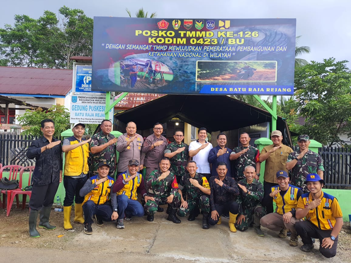Danrem 041/Gamas Brigjen TNI Jatmiko Aryanto SE.M.Han, Kasiter Korem 041/Gamas Letkol Inf Eko Prasetyo, Dandim 0407/Kota Bengkulu, Dandim 0423/BU Letkol Czi Muhamad Jumali, S.T.M.MT. selaku Dansatgas TMMD ke-126 Kodim 0423/BU dimana setibanya Tim di Lokasi Posko TMMD di sambut hangat oleh Forkopimda Bengkulu Utara.