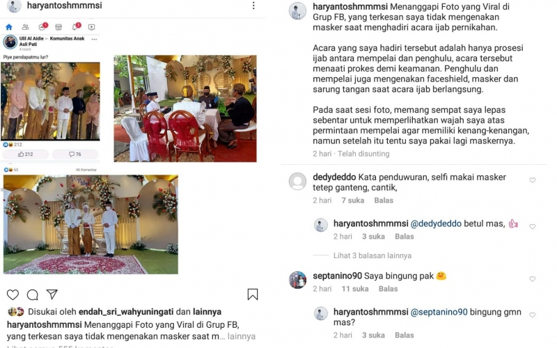 Dalam unggahan tersebut Haryanto mengklarifikasi bahwa dalam acara tersebut menjadi saksi dalam prosesi ijab qobul, itupun dengan protokol kesehatan yang ketat, ketika acara sesi poto dimulai memang masker sempat dilepas sebentar karena permintaan mempelai untuk kenang-kenangan. (pn/m@s)