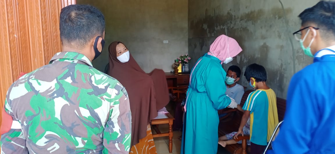 Mempawah – Babinsa Koramil 01/Jungkat,Serda Bambang bersama Babinkamtibmas mendampingi tim medis melaksanakan tes swab dirumah salah satu seorang warga yang berkontak erat dengan pasien terkonfirmasi Covid-19 di Segedong,Kabupaten Mempawah(02/5/2021)