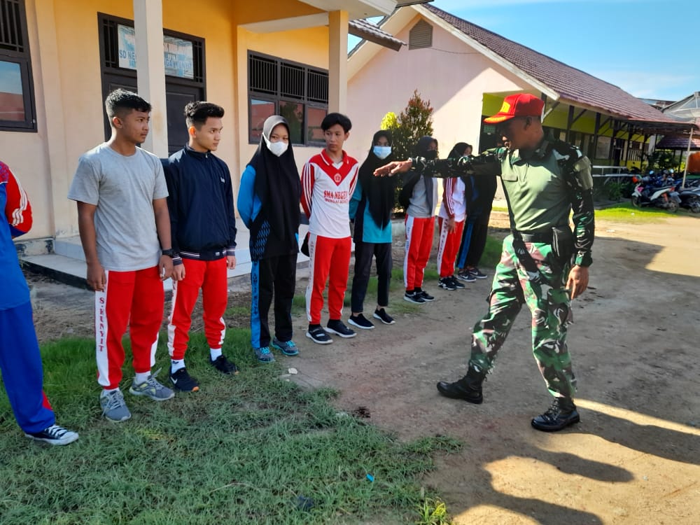 Mempawah– Bala Pembina Desa (Babinsa), Koramil 1201-04/Sungai Kunyit, Serda Hamdani melatih Peraturan Baris Berbaris (PBB) guna menanamkan kedisiplinan dan karakter para pelajar SMA Negeri 01 Sungai Kunyit, Kabupaten Mempawah, Rabu(2/6/2021).