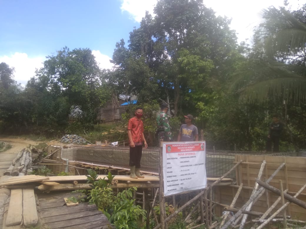 Landak – Babinsa Koramil 1201-10/Menyuke, Sertu Yanantoneli memantau perkembangan pembangunan jembatan beton yang menghubungkan ruas jalan antara Desa Meranti dan Desa Selange, Kecamatan Meranti, Kabupaten Landak, Rabu (2/6/2021)