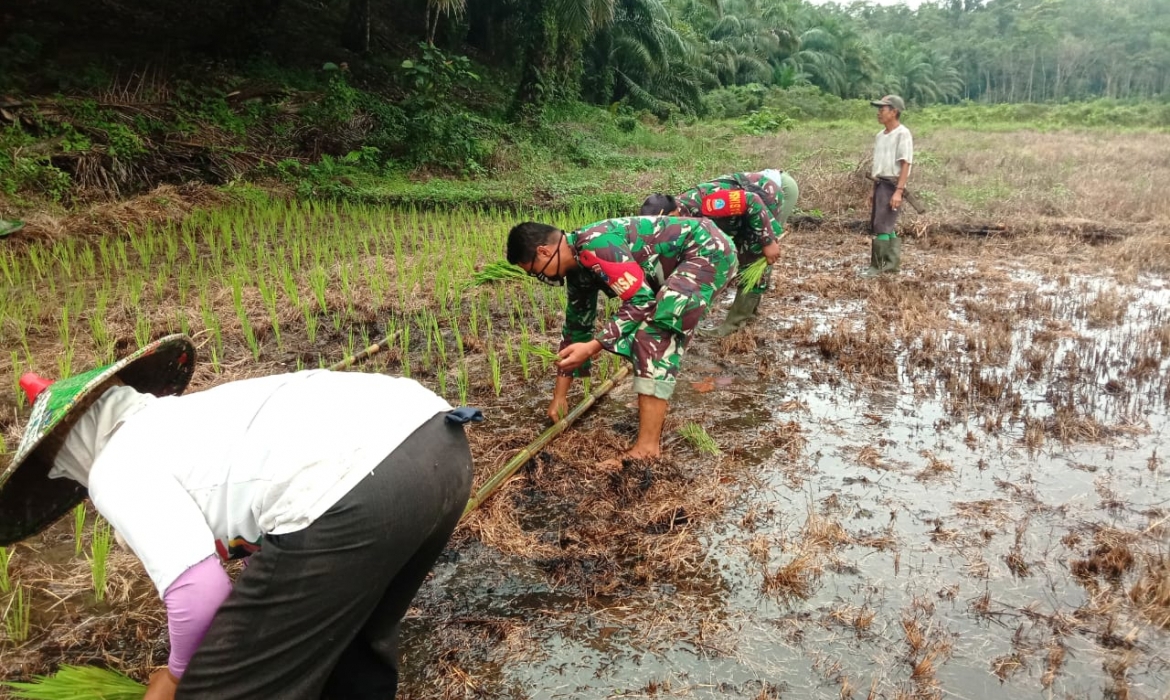 Landak – Babinsa Koramil 12/Air Besar Serda Masnar melaksanakan pendampingan penanaman padi dalam rangka mendukung ketahanan pangan bersama kelompok tani di Desa Sepangah, Kecamatan Air Besar Kabupaten Landak.