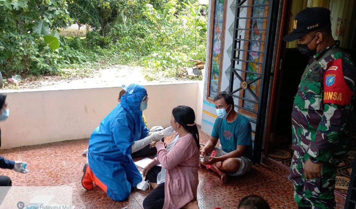 Mempawah – Babinsa Koramil 1201-05/Toho, Kodim 1201/Mempawah, Kopda Sugiono bersama Bhabinkamtibmas dan Tim PPKM melaksanakan tracing kepada warga yang berkontak erat dengan salah seorang pasien yang terpapar Covid-19 di Desa Sambora Kecamatan Toho, Kabupaten Mempawah. jum’at(28/5/2021).