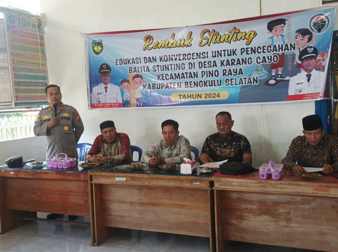 Bengkulu Selatan – Kapolsek dan Bhabinkamtibmas Polsek Pino Raya Polres Bengkulu Selatan Polda Bengkulu, Iptu Muh Amirudin, S.Sos., S.IP., dan Aipda Marzon Advawi hadiri rapat kerja Mini Lokakarya Pengendalian Stunting Desa Karang Cayo Kecamatan Pino Raya Kabupaten Bengkulu Selatan, Selasa (24/10/23).