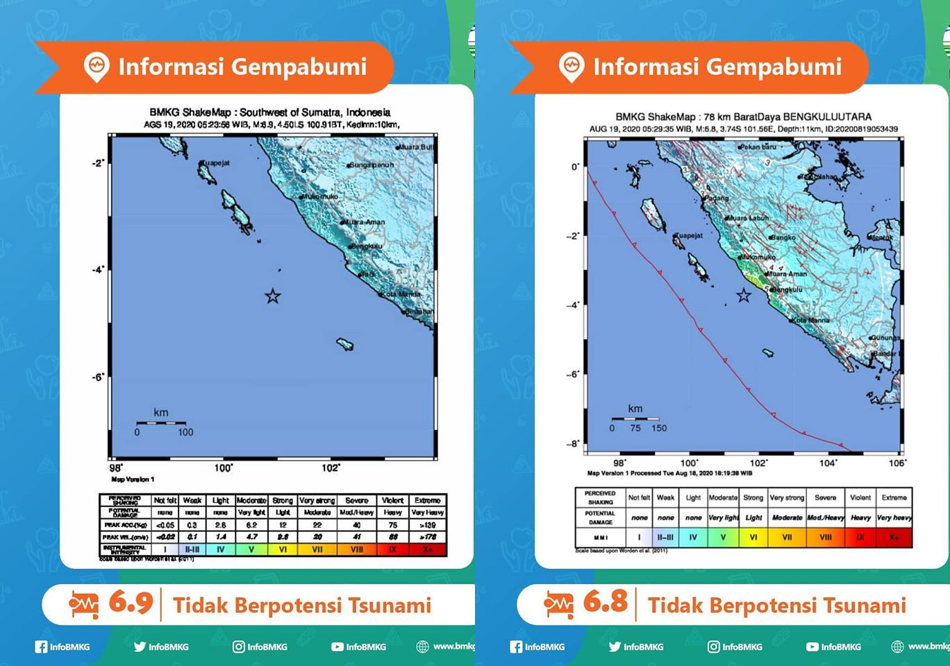 Bengkulu, Siberindo.co – Gempa bumi berkekuatan 6,9 magnitudo menguncang Kota Bengkulu dan sekitarnya pada Rabu (19/8/2020) pagi sekira pukul 05.23 WIB. Pusat gempa bumi berada di laut 169 km barat daya Bengkulu. Mengutip data dari Badan Meteorologi, Klimatologi dan Geofisika di laman resminya bmkg.go.id, gempa ini terasa juga hingga di Kabupaten Kepahiang, Liwa dan Kota Bumi.