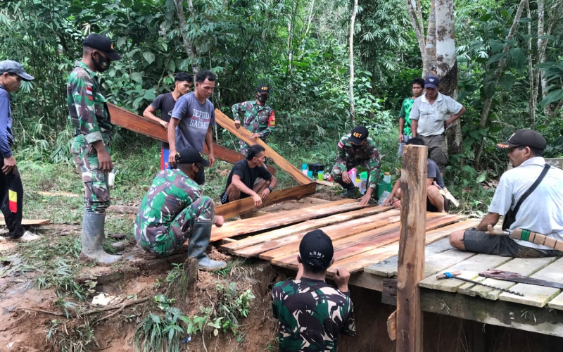 Satgas Pamtas RI-MLY Yonif 407/Padmakusuma, Pos Muakan bersama masyarakat melaksanakan kegiatan karya bhakti perbaikan jembatan yang rusak karena rapuh di Dusun Hilir RT 07/01 Desa Muakan Kecamatan Ketungau Hulu Kabupaten Sintang, Kalbar. Kamis (17/12/20)