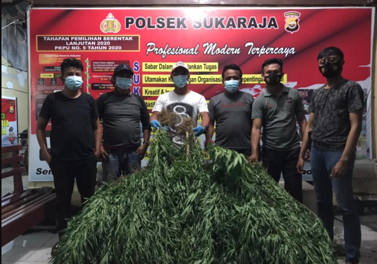 Sedangkan dilokasi kedua yakni milik terduga pelaku SI pihaknya menempuh perjalanan kaki selama 6 jam dari lokasi pertama serta berhasil menyita barang bukti berupa batang ganja sebanyak 200 batang dengan tinggi 150-200 cm.