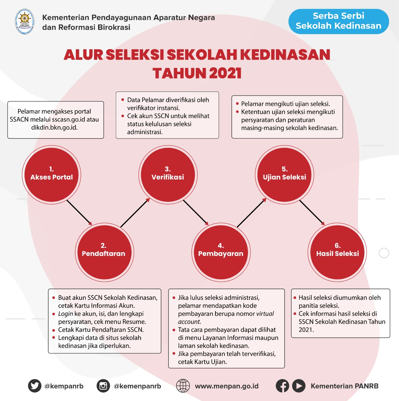 Kementerian Pendayagunaan Aparatur Negara dan Reformasi Birokrasi (PANRB) mengingatkan bahwa pelamar masih memiliki waktu untuk menyelesaikan proses pendaftaran hingga Jumat, 30 April 2021. Selain itu, pelamar juga diminta untuk memahami dan mencermati dengan detail seluruh persyaratan, ketentuan, hingga alur dan proses seleksi sekolah kedinasan, baik yang berlaku secara umum maupun yang berlaku berdasarkan masing-masing sekolah kedinasan yang dilamar. Demikian dilansir dari Kominfo RI.