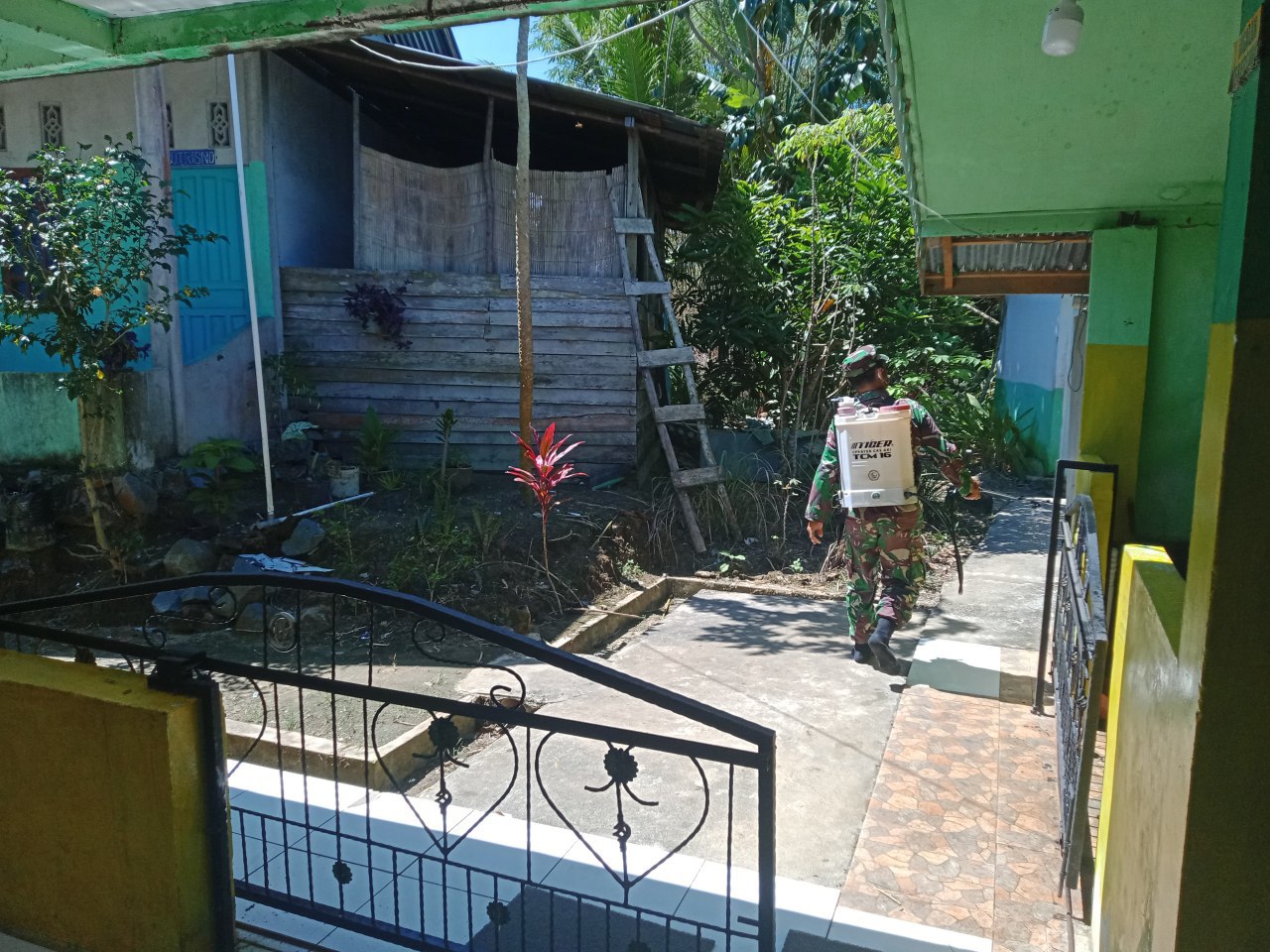 Babinsa bersama masyarakat Desa setempat bahu membahu melaksanakan penyemprotan disinfektan dengan sasaran, tempat fasilitas umum, tempat ibadah serta rumah warga yang terkonfirmasi Covid-19, penyemprotan disinfektan ini merupakan swadaya dari masyarakat setempat yang memiliki kesadaran tinggi guna mencegah penularan Covid-19.