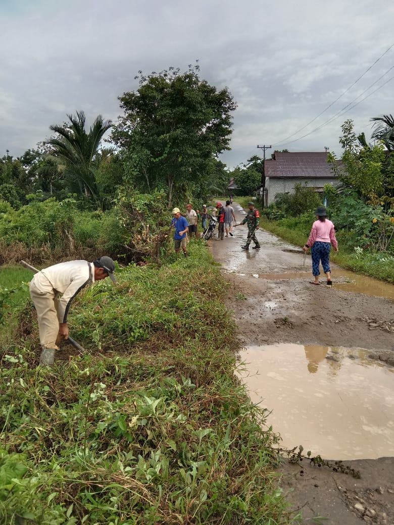 Mempawah – Babinsa Koramil 05/Toho, Kodim 1201/Mempawah, Serda Wafi melaksanakan kerja bakti pembersihan Jalan Umum di Desa Amawang, Kecamatan Sadaniang, Kabupaten Mempawah, Sabtu (19/6/2021