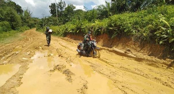 Landak – Kondisi jalan yang rusak parah tidak menyurutkan semangat Serda Kholil, Babinsa Koramil 1201-11/Ngabang untuk anjangsana ke Desa Sekais binaannya. Dia sangat memperhatikan dan menyayangi warga desanya, setiap minggu datang mengunjungi desanya yang terletak di bagian Timur Kecamatan Jelimpo, Jumat (19/6/2021).