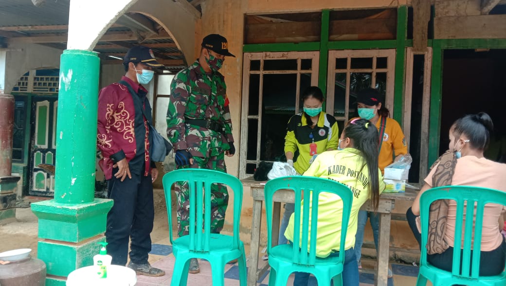 Landak – Babinsa Koramil 1201-10 Menyuke Sertu Yantoneli melakukan pendampingan Pos Pelayanan Terpadu (Posyandu) bertempat di rumah warga, Kegiatan yang merupakan suatu Implementasi kegiatan dalam menciptakan Kesehatan dimasyarakat, Sabtu (19/6/2021)