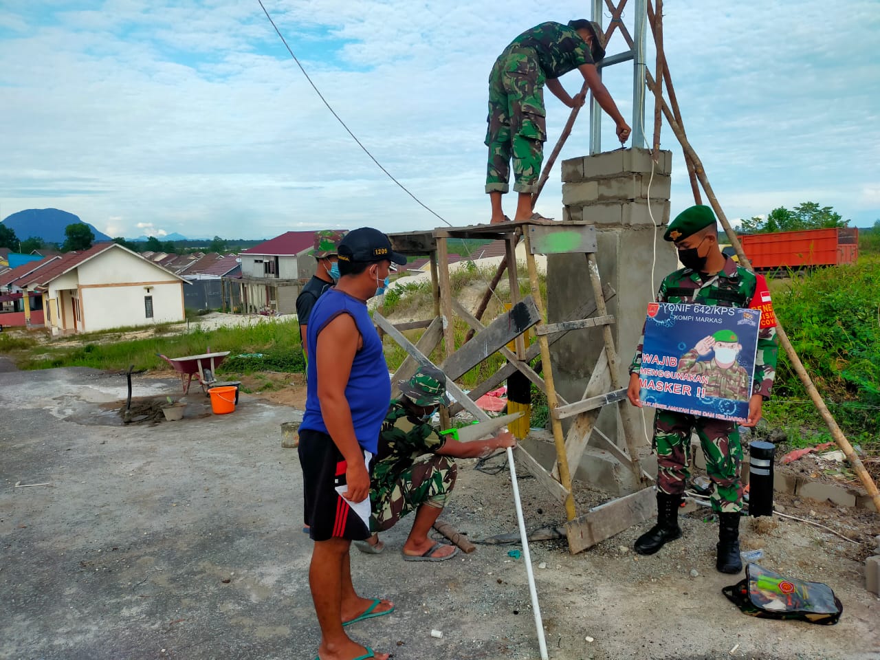 Sintang, Kalbar – Sesuai pengamalan 8 Wajib TNI, Kompi Markas Batalyon Infanteri 642/Kapuas turut serta membantu masyarakat dalam membuat gerbang.