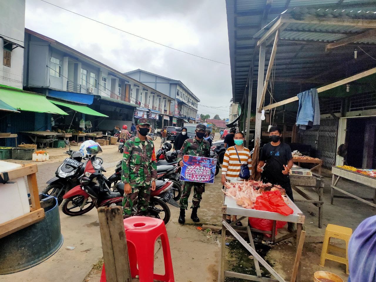 Melawi, Kalbar – Untuk mencegah penyebaran Covid – 19, Batalyon Infanteri 642/Kapuas mendatangi Pasar Rakyat guna menegakkan Protokol Kesehatan di sekitaran Kec. Nanga Pinoh, Kab. Melawi, Kalbar.