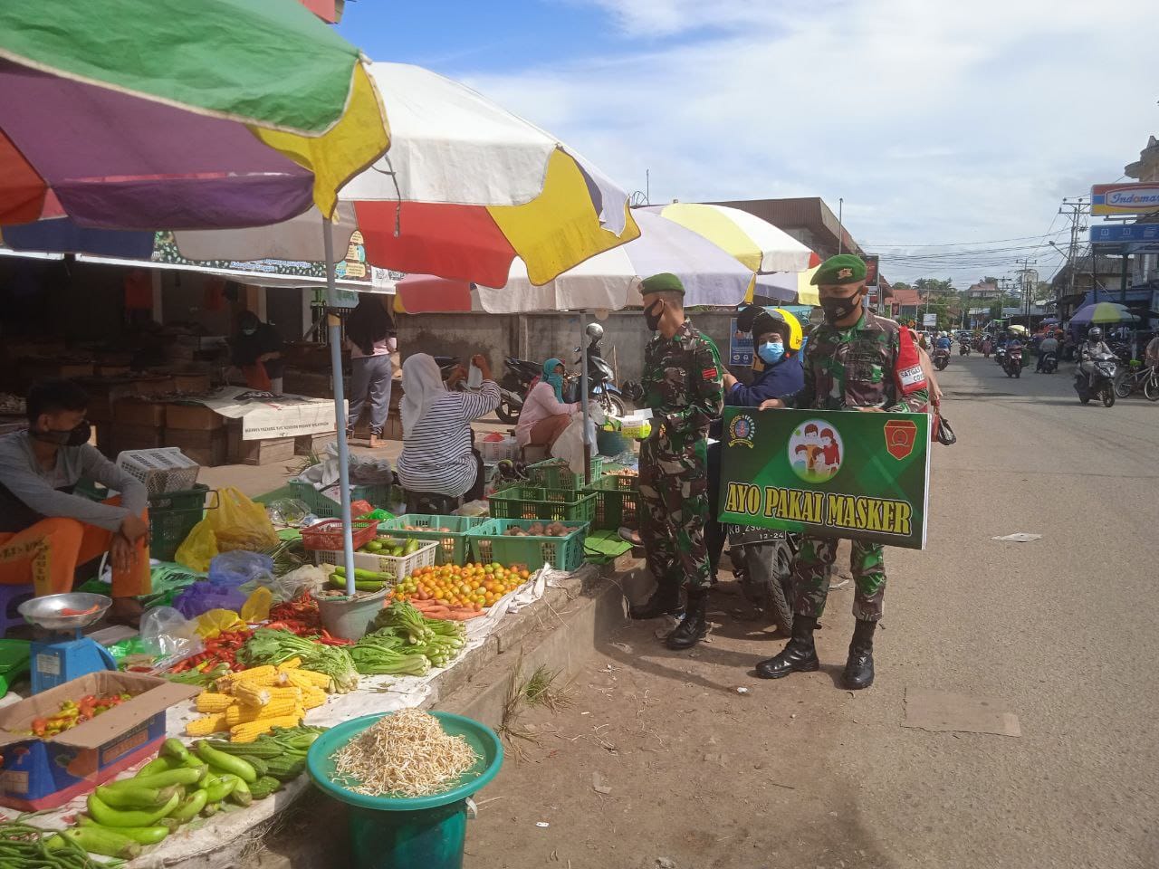 Sanggau, Kalbar – Untuk mencegah penyebaran Covid – 19, Batalyon Infanteri 642/Kapuas mendatangi Pasar Rakyat guna menegakkan Protokol Kesehatan di sekitaran Kec. Kapuas, Kab. Sanggau, Kalbar.