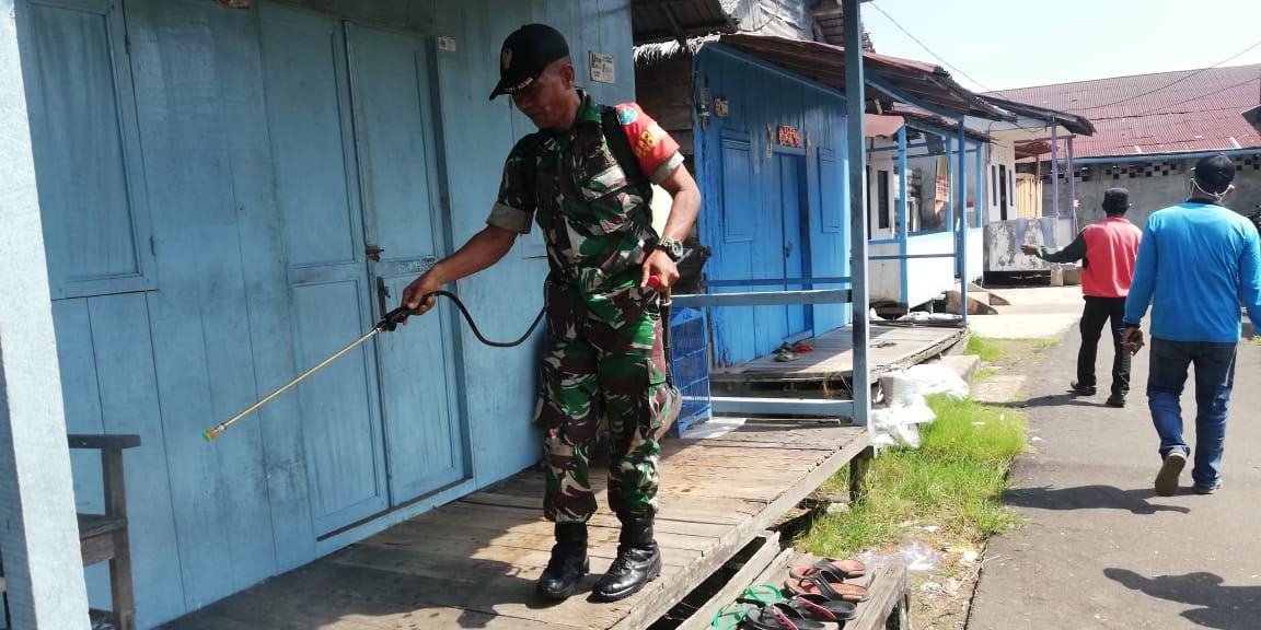 Mempawah – Anggota Koramil Mpawah Hilir Sertu Muhadi bersama Perangkat Desa melaksanakan penyemprotan disinfektan dengan sasaran Perumahan warga di Desa Kuala Secapah, Kecamatan Mempawah Hilir, Kabupaten Mempawah, Sabtu (19/6/2021).