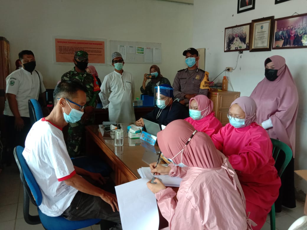 Babinsa Jungkat dan tim medis Puskesmas Segedong melakukan Vaksinasi yang pertama kepada karyawan perusahaan air minum dan pelaksanaan vaksin tersebut dilakukan di kantor tersebut.