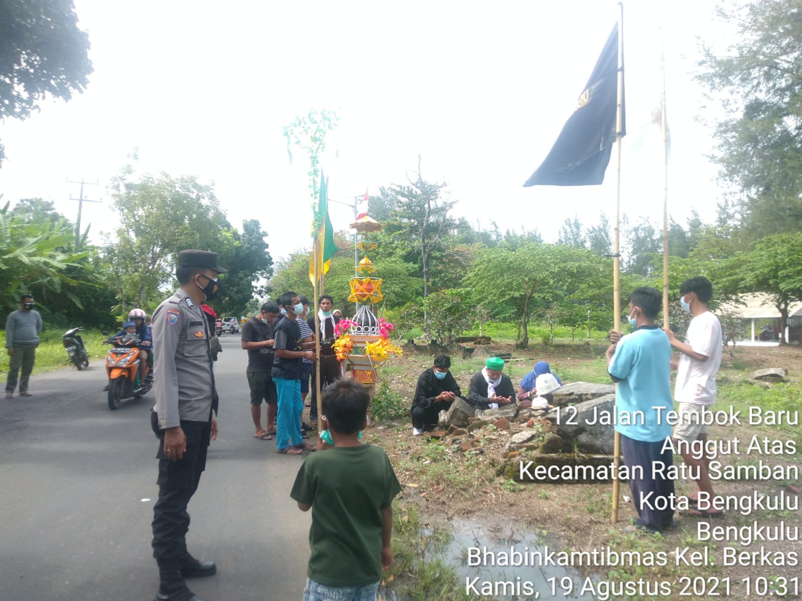 Meski demikian KKT (Kerukunan Keluarga Tabut) Tabut Kelurahan Berkas Kota Bengkulu tak mau melewatkannya begitu saja. Kamis (19/08/2021) telah berlangsung rangkaian kegiatan acara puncak dari Ritual tabut yaitu Tabut. Bhabinkamtibmas di Kelurahan Brigpol Jonson Carlos melaksanakan monitoring pengaturan dan pengawalan rangkaian tabot Tebuang di kelurahan Berkas yang rencananya tabot akan di buang di pantai Berkas. Sebelum kegiatan, Brigpol Jonson juga telah memberikan arahan kepada KKT untuk tetap mematuhi protokol kesehatan Covid-19.