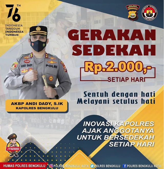 Gerakan Sedekah 2.000 setiap hari merupakan inovasi Kapolres Bengkulu agar anggotanya terbiasa dengan berbagi terlebih dimasa pandemi Covid 19. Ia mengatakan untuk berbagi tidak harus dengan nominal yang besar akan tetapi walaupun sedikit namun konsisten dapat memiliki dampak yang besar. terutama di tengah pandemi Covid-19 seperti ini, dengan berbagi ke sesama yang membutuhkan dapat meringankan beban orang lain.
