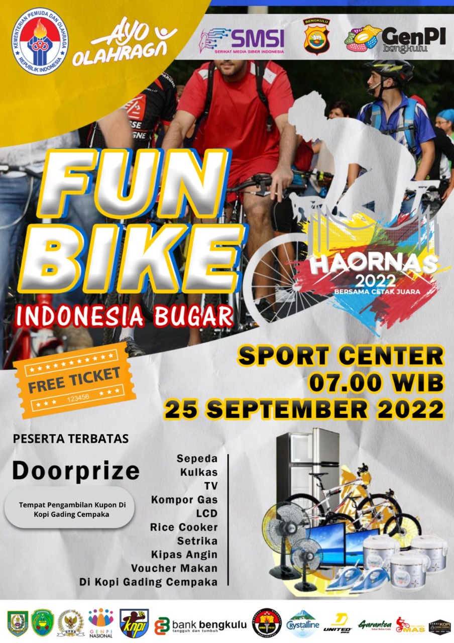 Siberindo.co, Bengkulu – Memperingati Hari Olahraga Nasional 2022, Serikat Media Siber Indonesia (SMSI) Bengkulu bekerjasama dengan Genpi Bengkulu, Polda/Polres Bengkulu, dan mitra kerja, menyelenggarakan event “Fun Bike” dengan tema “Indonesia Bugar”. Kegiatan ini akan dipusatkan di Sport Center Kota Bengkulu pada Minggu 25 September 2022. Selain event Fun Bike, nantinya juga akan digelar santunan anak yatim kerjasama dengan Baznas Kota Bengkulu.