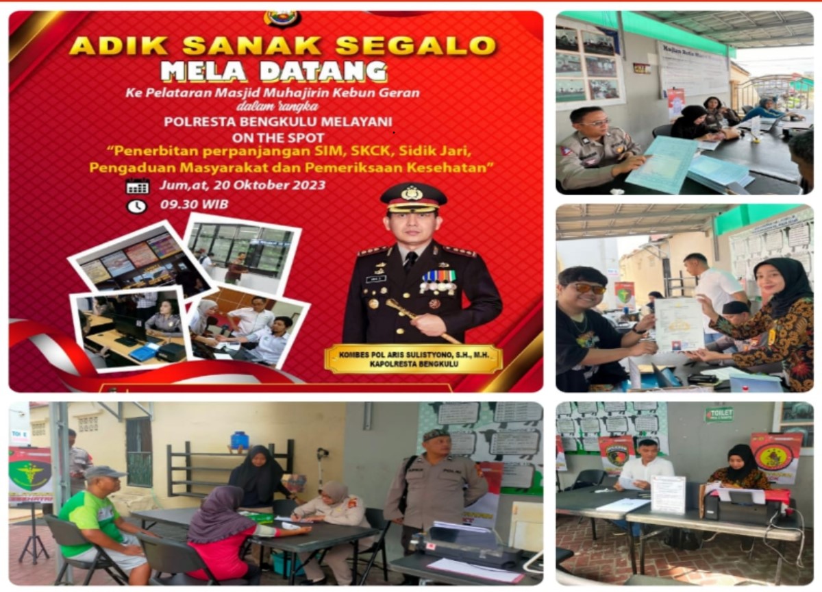 Bengkulu – Dalam rangka memberikan pelayanan yang prima kepada warga Kota Bengkulu, Polresta Bengkulu Polda Bengkulu melaksankan kegiatan pelayanan masyarakat On The Spot Polresta Bengkulu, di Masjid Muhajirin Kelurahan Kebun Geran Kecamatan Ratu Samban Kota Bengkulu, Jumat (20/10/2023) pagi.