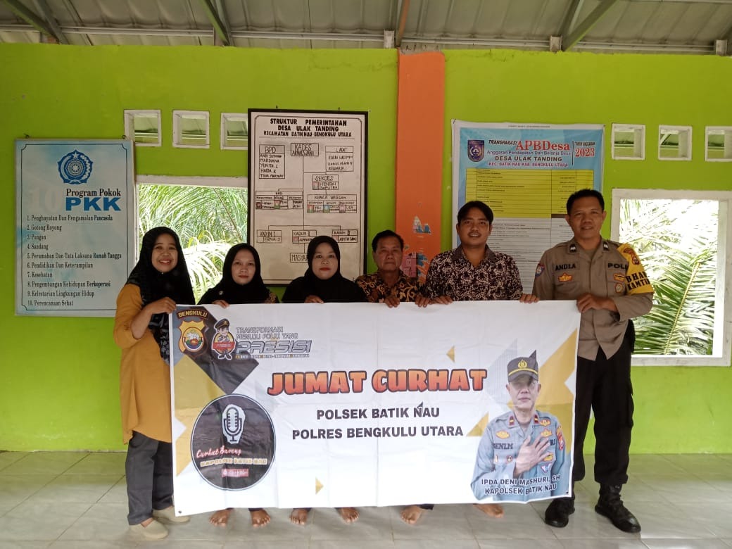 Bengkulu Utara – Polsek Batiknau Polres Bengkulu Utara Polda Bengkulu, mengelar acara Jumat curhat yang dilaksanakan dikantor Desa Ulak Tanding Kecamatan Batiknau Kab Bengkulu Utara dengan mengumpulkan warganya untuk mendengarkan keluh kesahnya. Jumat (20/10/2023)
