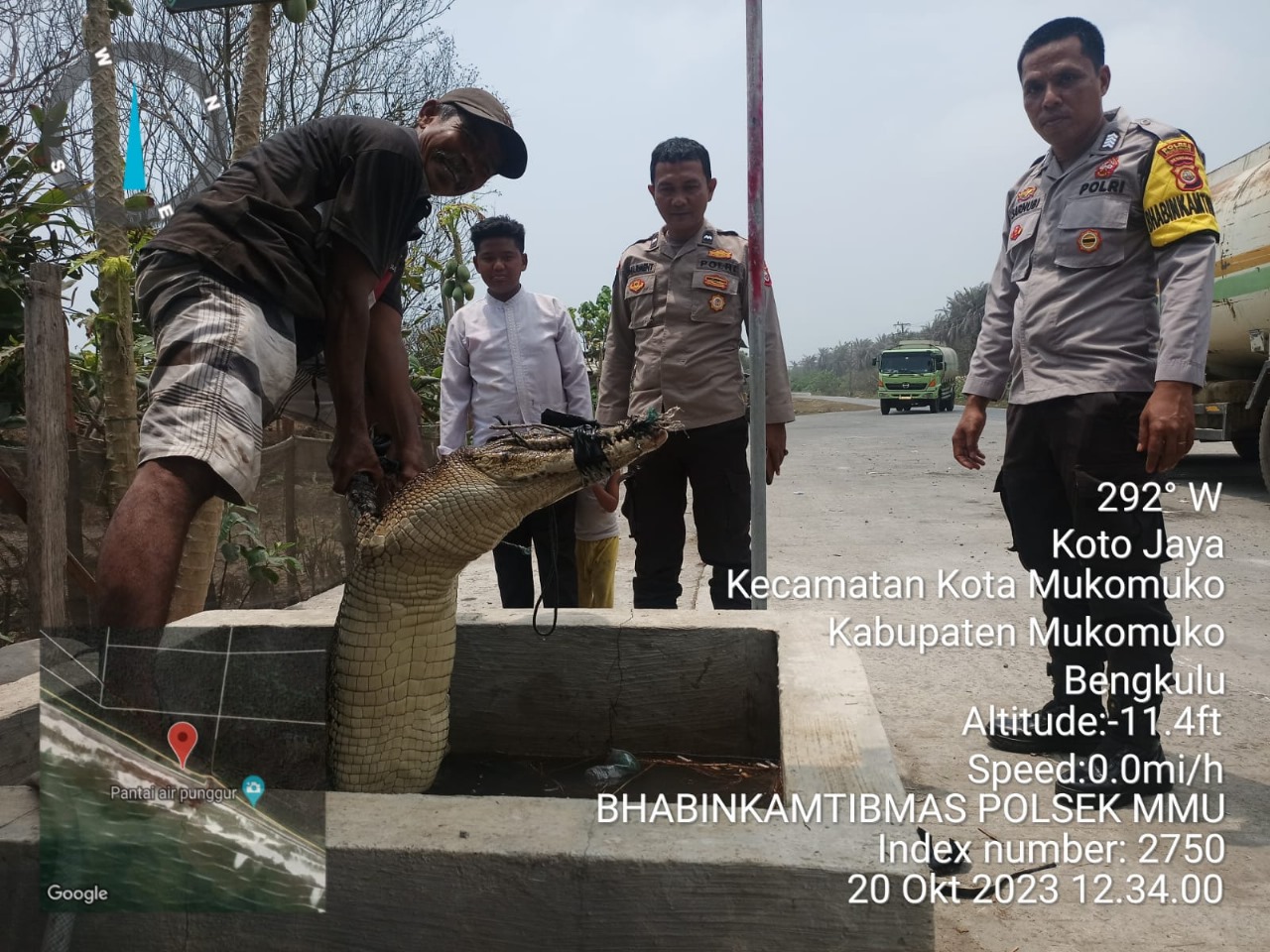 Mukomuko – Jumat (20/10/2023), Pukul 09.00 WIB bertempat di sumur darurat perbatasan antara Kecamatan Air dikit dengan Kecamatan Kota Mukomuko Kabupaten Mukomuko, telah ditemukan satu ekor Buaya Muara oleh warga Kelurahan Koto Jaya Kecamatan Kota Mukomuko.