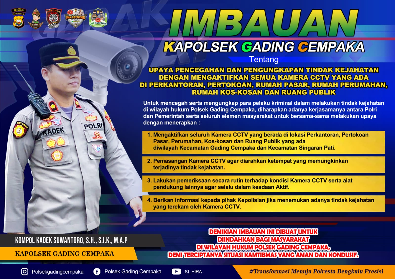 Bengkulu – Kapolresta Bengkulu Polda Bengkulu Kombes Pol Deddy Nata, S.I.K., melalui Kapolsek Gading Cempaka Kompol Kadek Suwantoro, S.H., S.I.K, M.A.P., mengimbau agar masyarakat mengaktifkan CCTV di perkantoran, pertokoan, rumah pasar, rumah perumahan, kos-kosan, dan ruang publik.