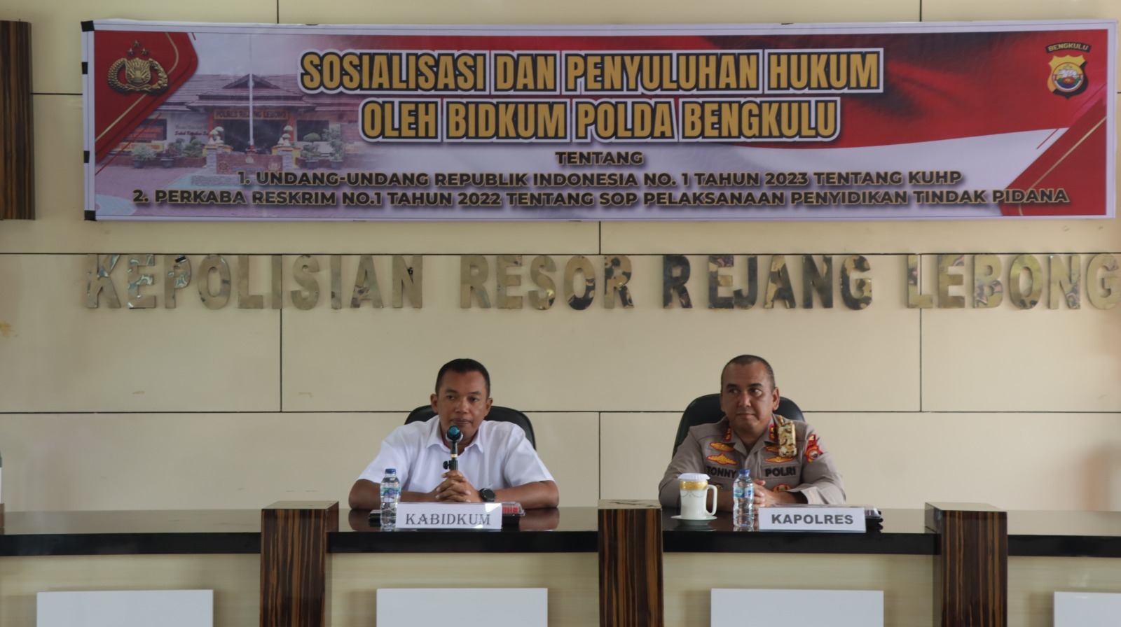 Dijelaskan oleh Kapolres Rejang Lebong Polda Bengkulu Melalui Kasi Humas Iptu Bertha Ginting bahwa “Sosialisasi dan Penyuluhan Hukum yang dilaksanakan oleh Bidkum Polda Bengkulu berkaitan tentang Undang – Undang Republik Indonesia No.1 Tahun 2023 tentang KUHP Serta tentang SOP Pelaksanaan Penyidikan Tindak Pidana.