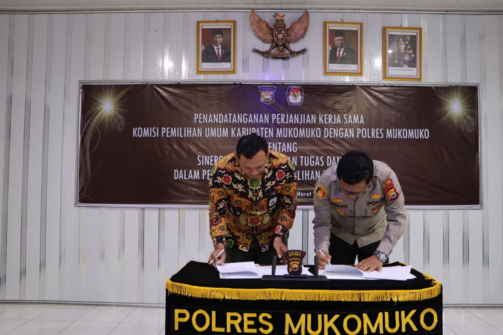 Diakhir kegiatan usai sambutan dari Kapolres Mukomuko dan Ketua KPU Kab. Mukomuko, dilanjutkan dengan penandatangan perjanjian kerjasama antara kedua belah pihak disaksikan oleh Wakil Bupati Mukomuko, Ketua DPRD Kab. Mukomuko, Kajari Mukomuko, Dandim 0428 Mukomuko, Ketua Bawaslu, Ketua Pengadilan Negeri Kab. Mukomuko, Kapolsek dan Personil Polres Mukomuko dan Instansi terkait.