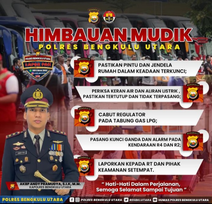 Bengkulu Utara – Polres Bengkulu Utara Polda Bengkulu, menyampaikan imbauan untuk para pemudik. Imbauan tersebut disebarluaskan melalui media sosial Polres Bengkulu Utara, Polsek jajaran, dan media massa.