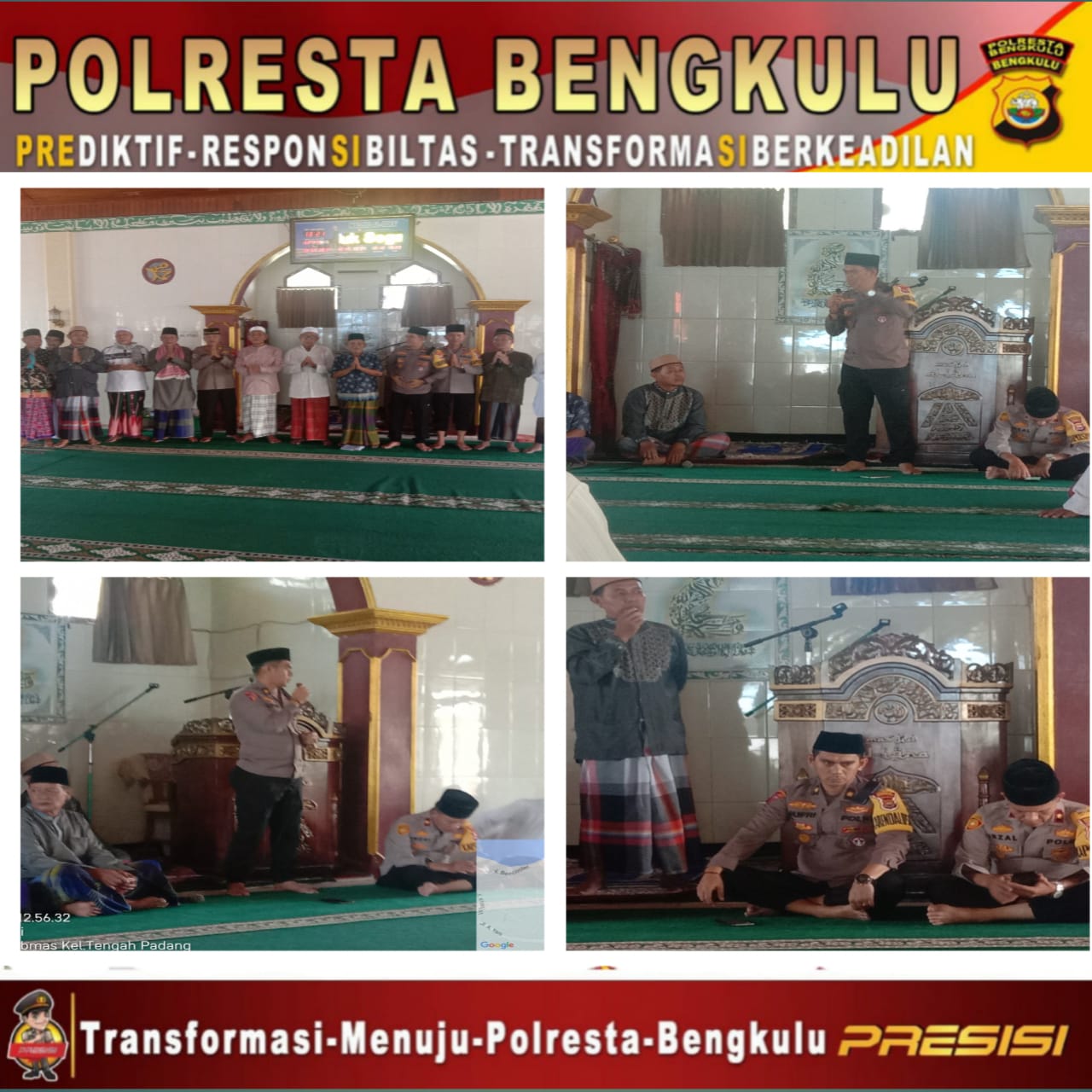 Bengkulu – Dalam rangka menjalin komunikasi dan silahturahmi kepada masyarakat, Kapolresta Bengkulu diwakili dengan Kapolsek Teluk Segara Kompol Irzal, S.H., bersama dengan Kabag Ops Polresta Bengkulu Kompol Jufri, S.H., S.I.K, dan Personel melaksankan kegiatan “Jumat Curhat” dengan menyambangi langsung warga masyarakat Jalan Iskandar 9 RT.08 RW.03 Kelurahan Tengah Padang Kecamtan Teluk Segara Kota Bengkulu.