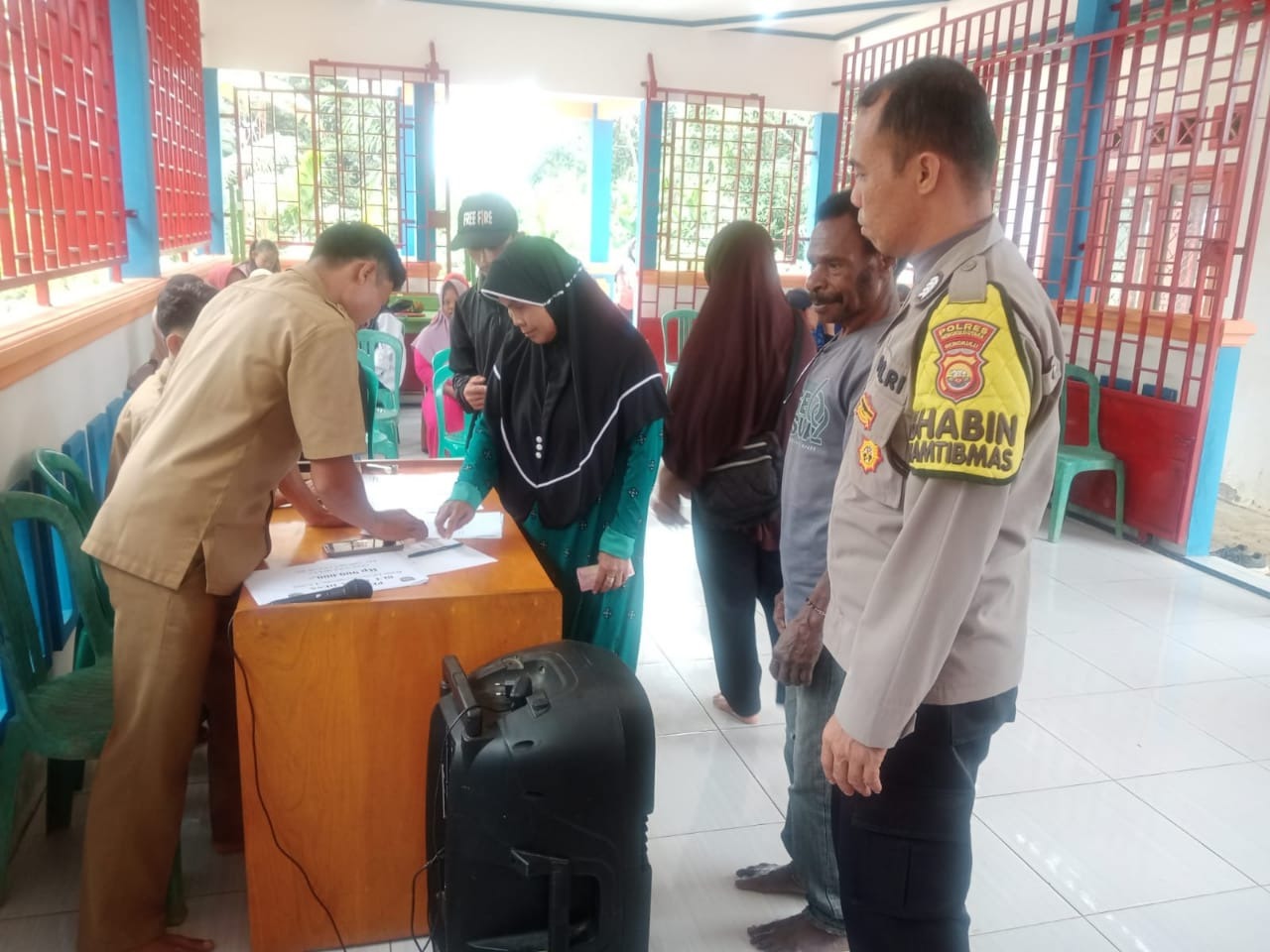 Bengkulu Utara – Bhabinkamtibmas Polsek Giri Mulya Polres Bengkulu Utara Polda Bengkulu, Bripka Wisnu Nugroho menghadiri kegiatan penyaluran BLT yang bersumber dari Dana Desa Suka Mulya Bulan Juli, Agustus dan September Tahun 2023 kepada Keluarga Penerima Manfaat (KPM) Desa Suka Mulya Kecamatan Giri Mulya Kabupaten Bengkulu Utara, Kamis (21/09/2023).