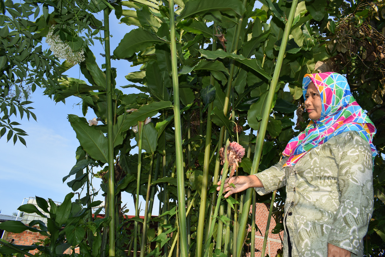 “Di sekitar rumah ditanami beragam tanaman pangan kacang panjang, kacang koro, cipir, kecombrang, pucuk ubi dan masih banyak lagi. Mungkin ada sekitar 50 jenis tanaman pangan,” tutur Rita Wati saat memetik sayur di halaman rumahnya pada Minggu sore (4/10/20).