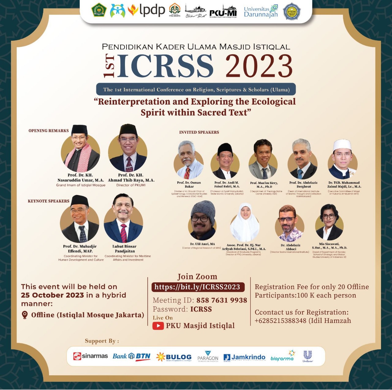 “1st International Conference of Religion, Scriptures, and Scholars (ICRSS) 2023 adalah wadah bagi para akademisi untuk menyampaikan wawasan dan insight dalam bidang akademik, terkhusus studi Islam, dalam menanggapi isu aktual yang kini menjadi perbincangan di lingkungan PBB, yaitu isu ekologi” ungkap Prof. Dr. KH. Nasaruddin Umar, MA Imam Besar Masjid Istiqlal.