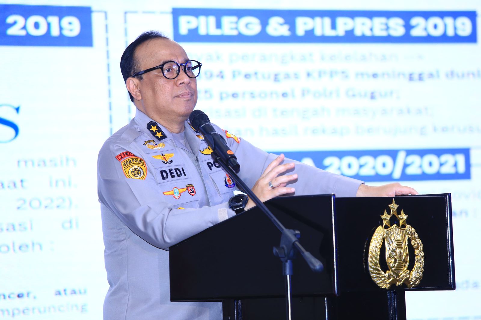 Jakarta. Asisten Kapolri bidang SDM Irjen Dedi Prasetyo memberikan pembekalan dalam anev dan koordinasi fungsi kehumasan bertajuk Optimalisasi Pengelolaan Media Digital Oleh Humas Polri Dalam Rangka Mendukung Terselenggaranya Pemilu Damai 2024.
